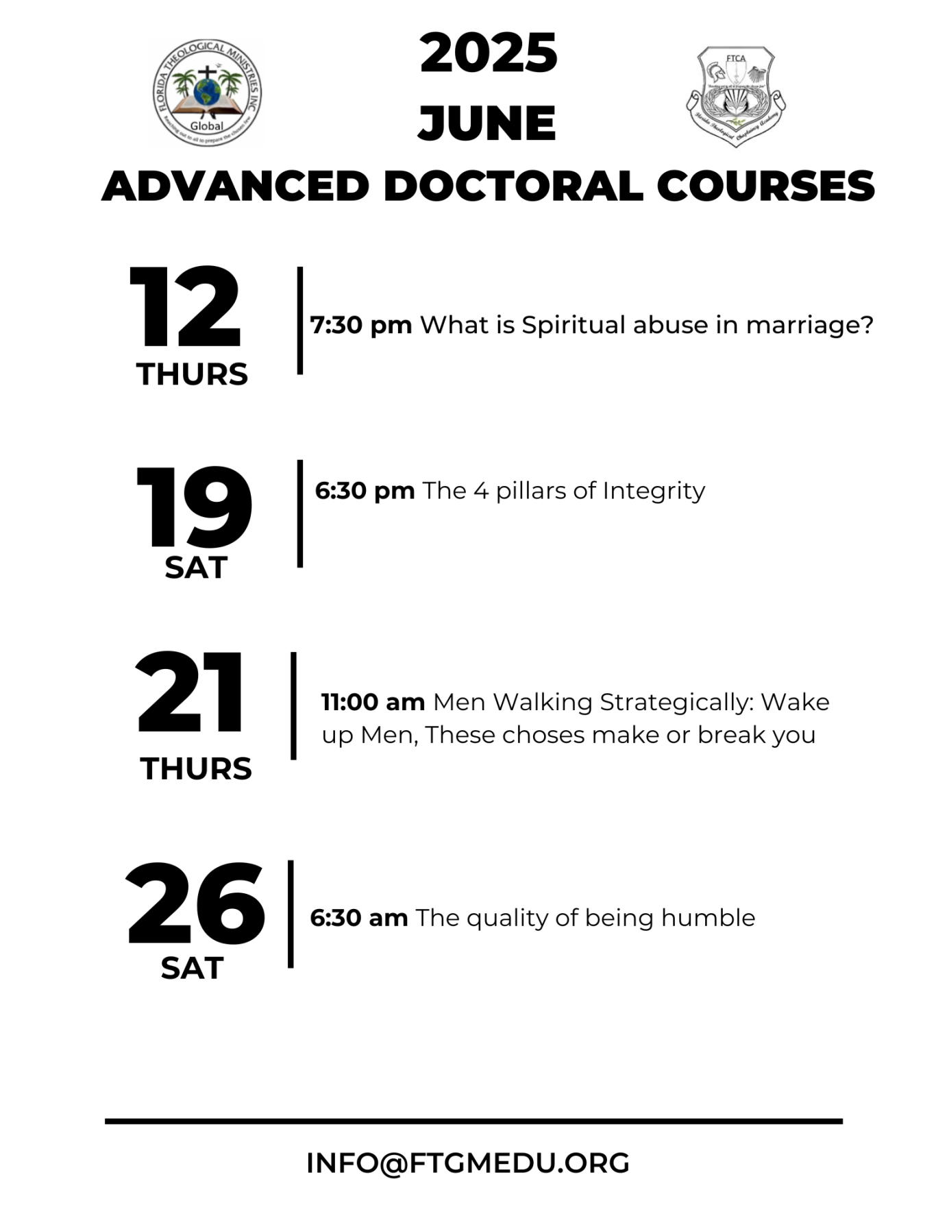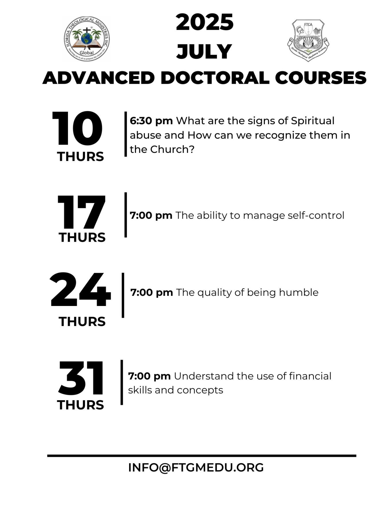 Achieve your goals while embracing Advanced Doctoral Courses through our empowering one-class-at-a-time course scheduling. These courses prepare us to triumph over life's challenges! Choose to teach or attend a course, and experience the benefits of our online environment.
