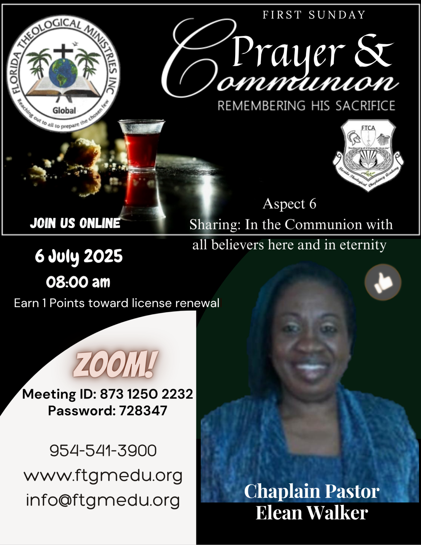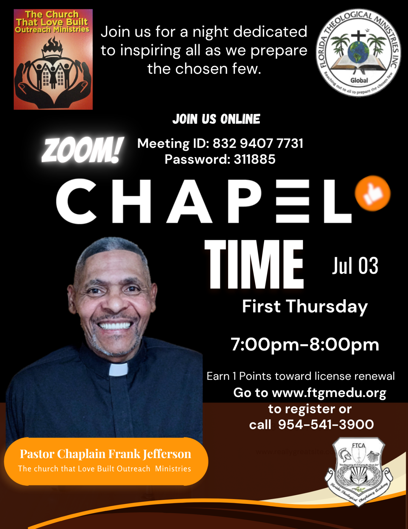 Florida Theological Global Ministries (FTGM) invites you to Chapel Services on the first Sunday and Thursday of each month to gain knowledge and inspiration. By embracing prayer, dedicating time to study, and participating in active service, you will discover a renewed sense of purpose and deep fulfillment in your life.